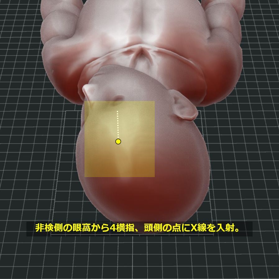 頭尾方向に45°の斜入射をするため、フィルムは顎が欠けないように(足側に)置く。
