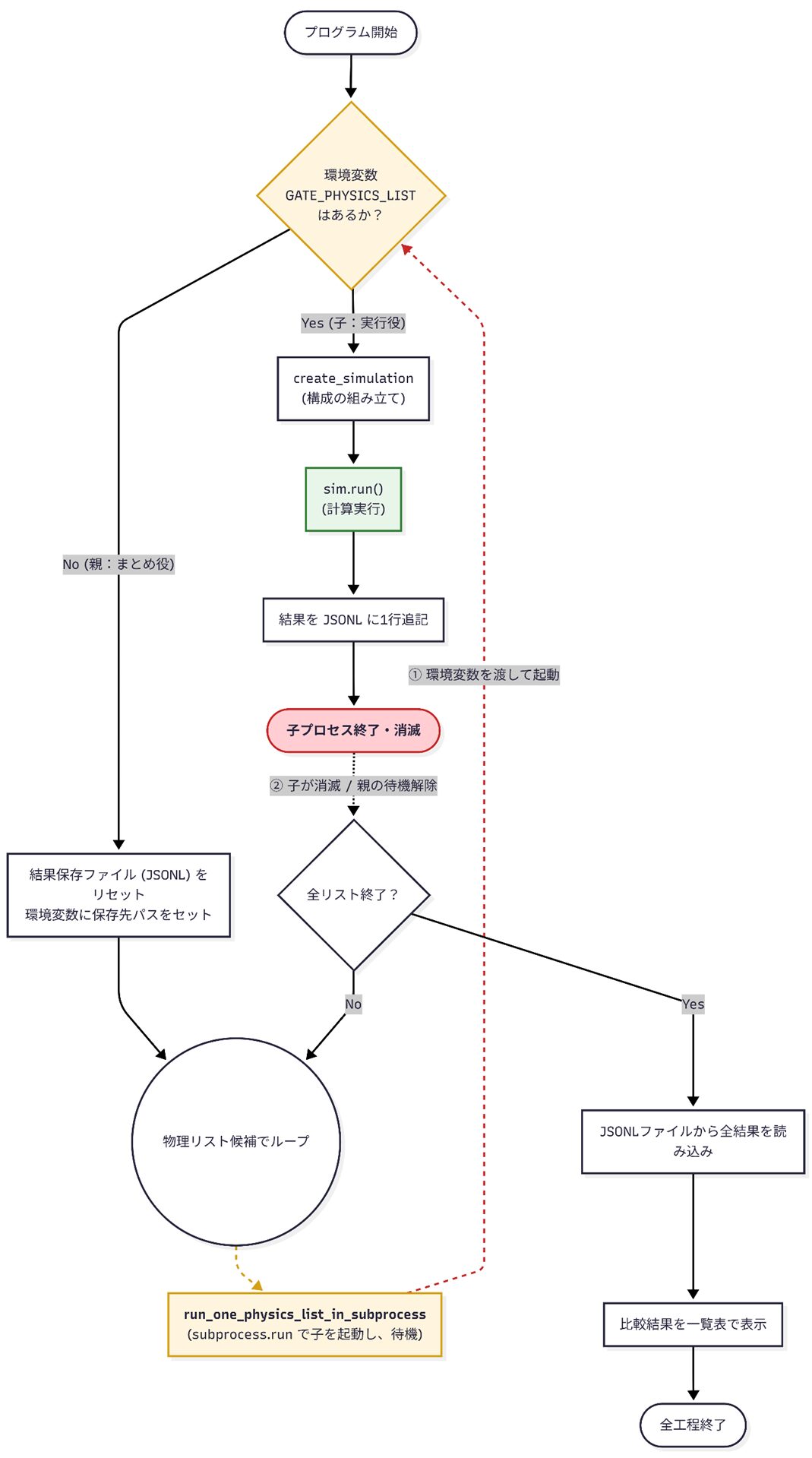- 子プロセス側は環境変数 GATE_PHYSICS_LIST を見て単発実行する