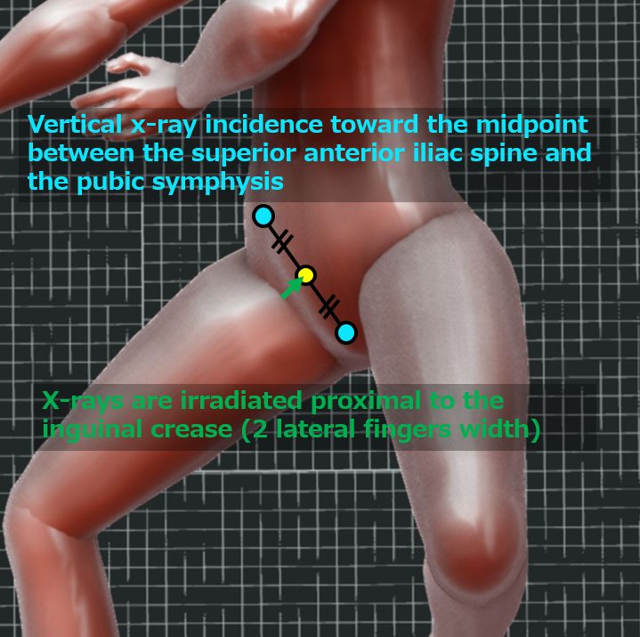 CR : Perpendicular to the midpoint of the line connecting the superior anterior iliac spine and the pubic symphysis. (2 lateral fingers proximal to the inguinal crease)