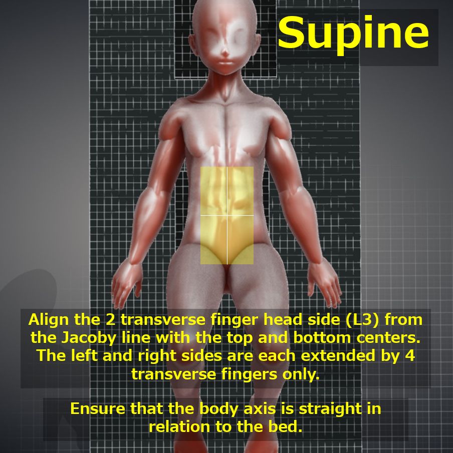 Supine : The superior border should extend to include the 12th thoracic vertebra and the inferior border should include the superior sacrum.